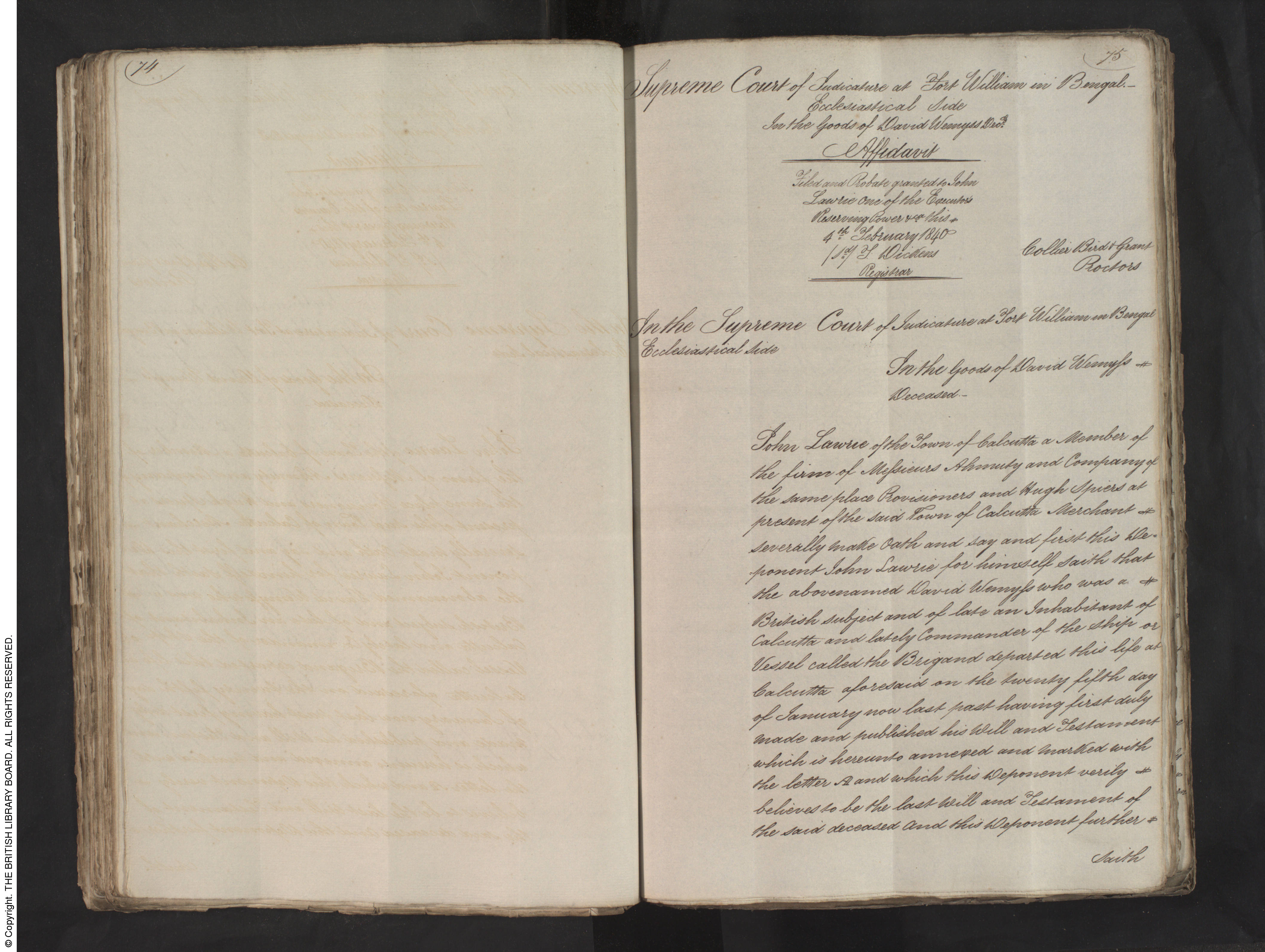 In the name of God, Amen, I David Wemyss mariner at present residing in Calcutta being of sound and disposing mind, memory and