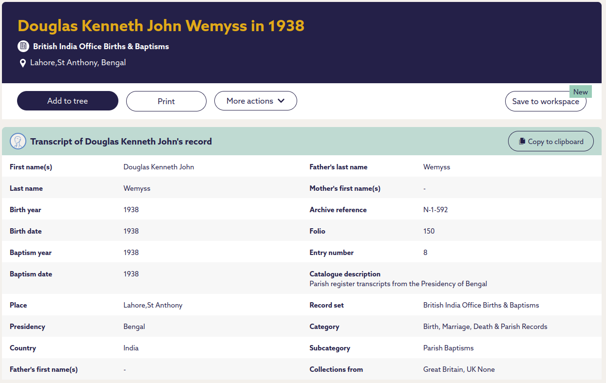 | Son | Douglas Kenneth Wemyss | 02/12/1938 | 15/02/1958 | Valerie Ford | 20/05/2024 | Swindon, UK |